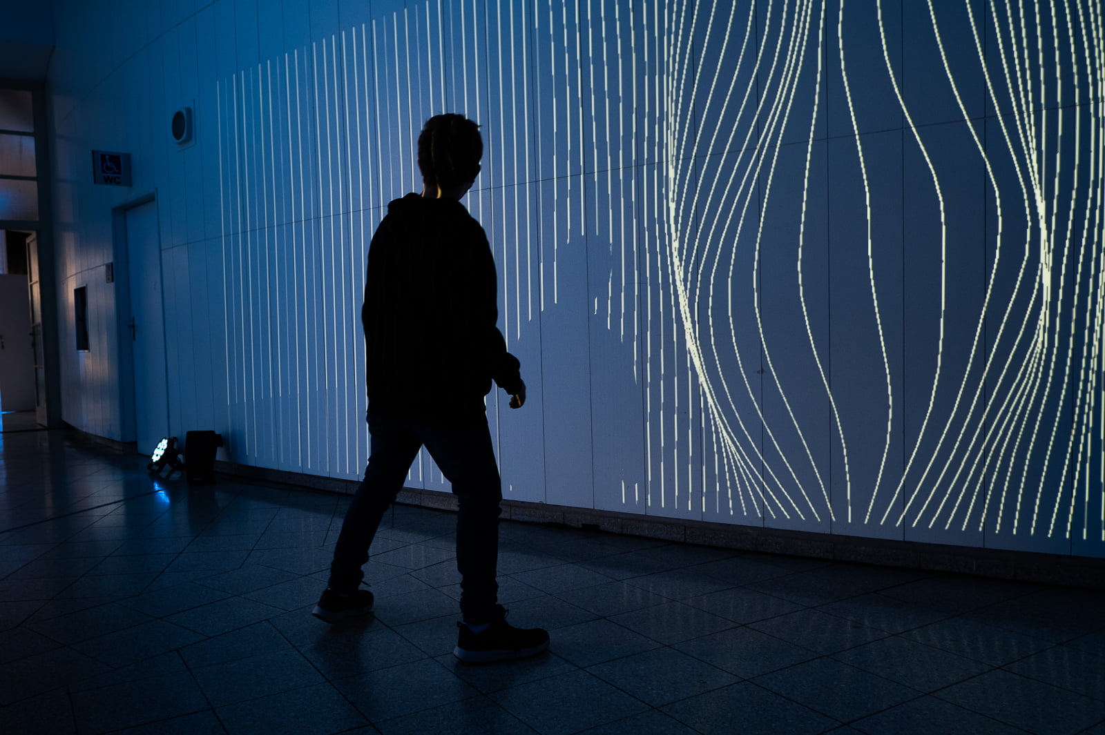 An interactive site-specific installation primarily works with horizontal space and vertical lines, creating a symbolic musical instrument made out of lines that deform and emit sound when the viewer moves through them. The work carries a reference to the theory of “the music of the spheres”. A concept introduced by Pythagoras, in which he claims that every object, whether animate or inanimate, moves in a specific rhythm and resonates with a specific vibration. Each line thus has its own tone and each movement through the installation environment resonates it in its own way.